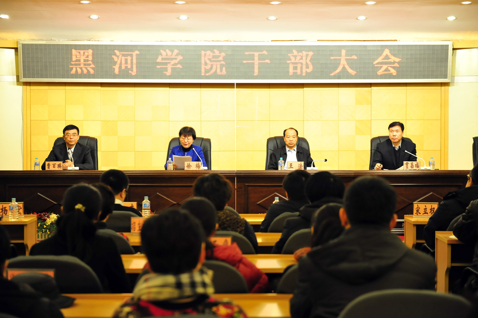 本网讯(记者 王佳)1月27日上午,学院召开了领导干部大会。省委组织部部务委员王法同志宣读了中共黑龙江省委关于曹百瑛同志任黑河学院党委书记的决定,省委高校工委书记、省教育厅党组书记、厅长徐梅同志在会上作了重要讲话,新任学院党委书记曹百瑛作履职发言,学院院长贯昌福主持会议。