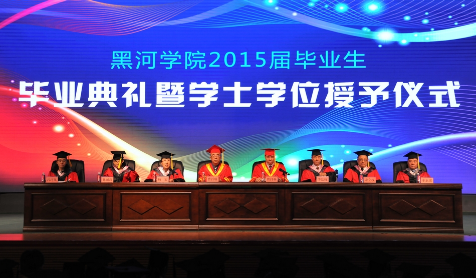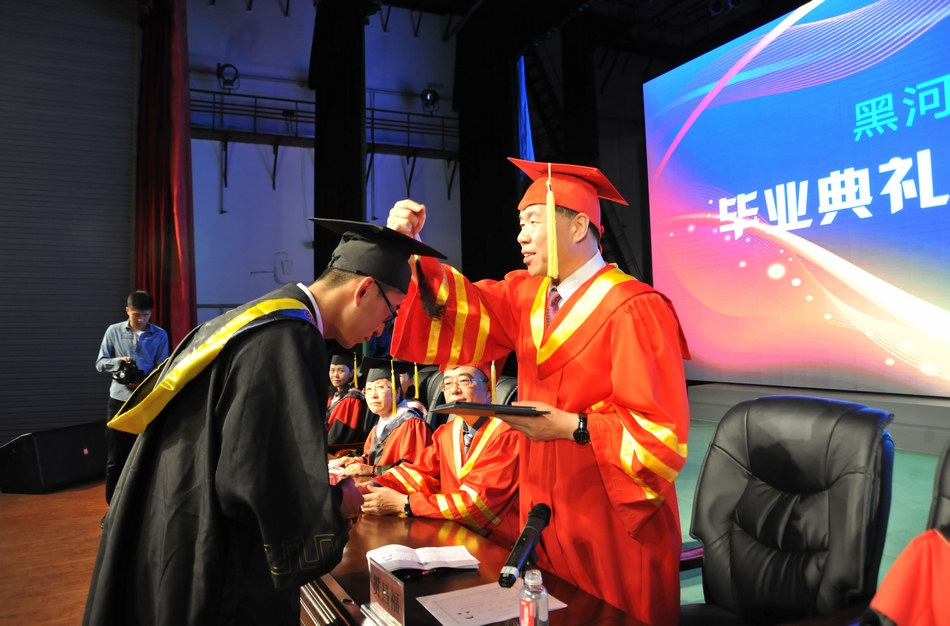 毕业典礼在《黑河学院院歌》声中拉开帷幕。校长贯昌福在毕业典礼上发表讲话,为毕业生代表拨流苏,颁发学位证书和毕业证书。他代表学校对圆满完成学业的同学们表示热烈的祝贺,向多年来为同学们健康成长付出辛勤劳动的广大教职员工表示崇高的敬意。他说,大学是人生的重要阶段,大学阶段奠定了未来事业发展的坚实基础。四年前,同学们怀揣着梦想进入黑河学院,四年中,同学们在学习中转变,在转变中成熟。校长贯昌福充分肯定了毕业生在校期间取得的优异成绩和为学校赢得的荣誉,对毕业生为学校发展建设所作出的贡献表示衷心的感谢。他鼓励同学们做一个志存高远、追求卓越的人,做一个品德高尚、懂得感恩的人,做一个明理诚信、敢于担当的人,做一个谦虚谨慎、勤学善思的人。