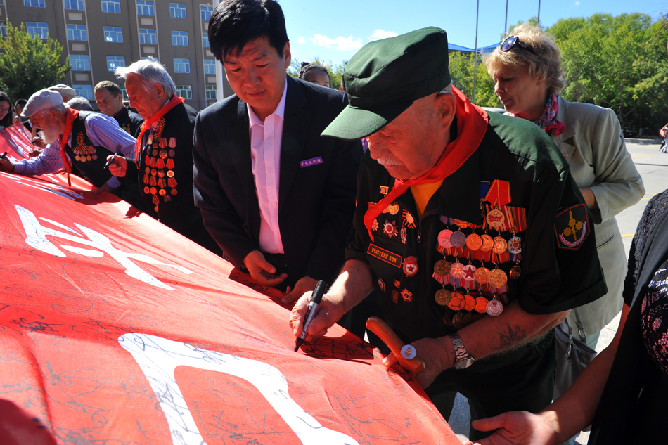 据悉,参加签名活动的俄罗斯老战士平均年龄87,最大的已有96岁,他们有的参加过解放长春、沈阳、牡丹江等地的战斗,和中国人民一起与日本关东军展开殊死搏斗,为打败日本侵略者,取得抗日战争和世界反法西斯战争最后胜利作出了重要贡献。