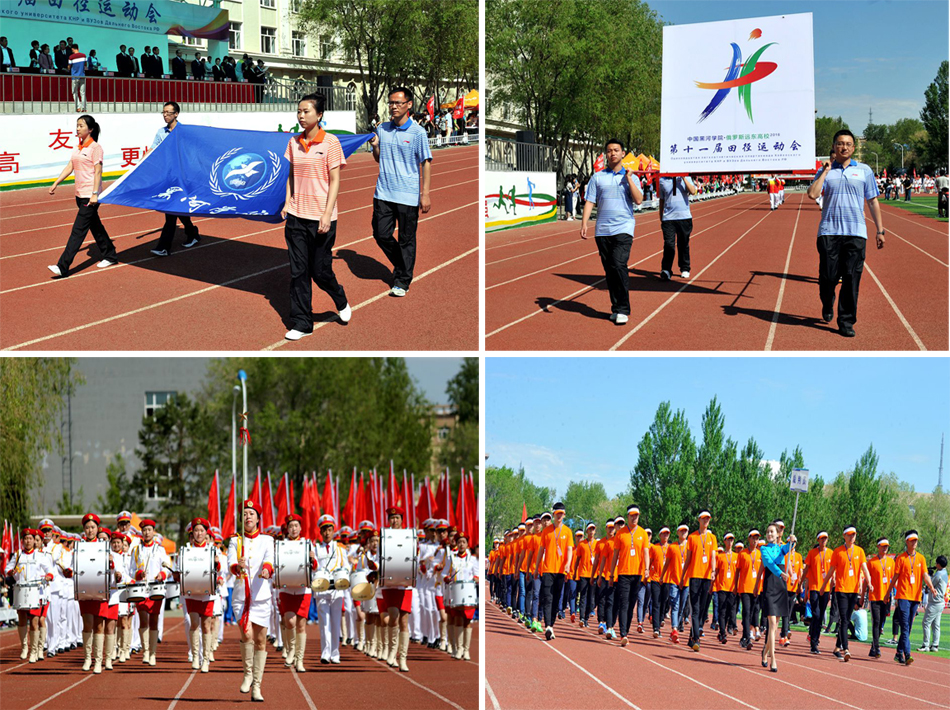 伴随着激昂嘹亮的《运动员进行曲》,步伐矫健的裁判员队伍、教职工代表队、俄罗斯远东高校代表队及由各学院组成的学生方阵迈着铿锵有力的步伐依次入场,以昂扬向上的青春风姿走过主席台,接受检阅。音乐学院管乐队奏响中华人民共和国国歌,鲜艳的五星红旗在运动场冉冉升起,迎风飘扬。