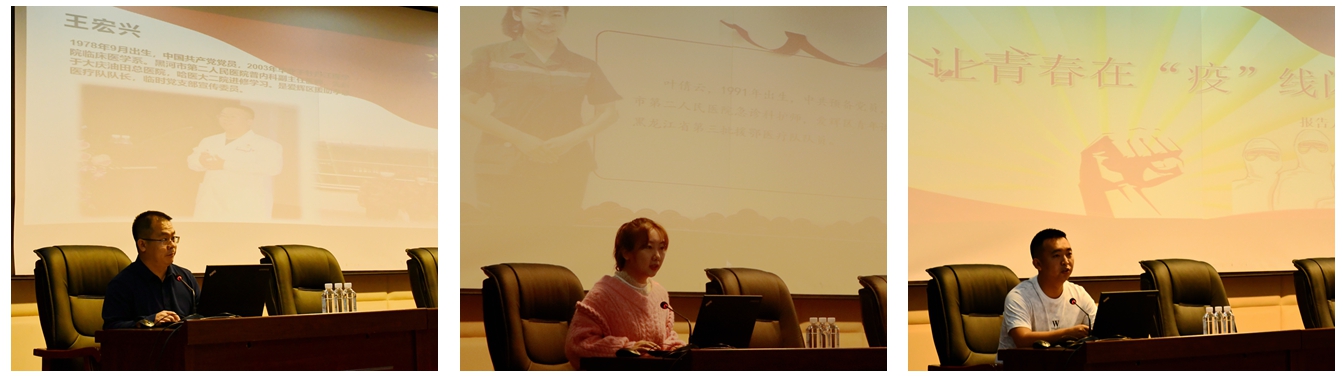 本次报告会旨在深入贯彻《新时代公民道德建设实施纲要》,大力宣传展示公民道德建设成果成效,在全校进一步掀起公民道德建设热潮,切实发挥黑河学院与爱辉区新时代精神文明实践中心作用,弘扬伟大的抗疫精神,凝聚前行力量。报告会上,黑河市第二人民医院副院长王宏兴、急诊科护士叶倩云、血液透析科护士孙湛凯分别结合自身经历,用朴实生动的语言,从不同的角度讲述了自己驰援湖北孝感医疗队的故事。他们顾不得新婚的爱人,顾不得未成年的孩子,留下了出发前的合影,做好了壮士一去不复归的准备.....抗疫背后的故事,让师生们无不热泪盈眶、感动万分,他们的英雄事迹赢得了师生们经久不息的掌声。