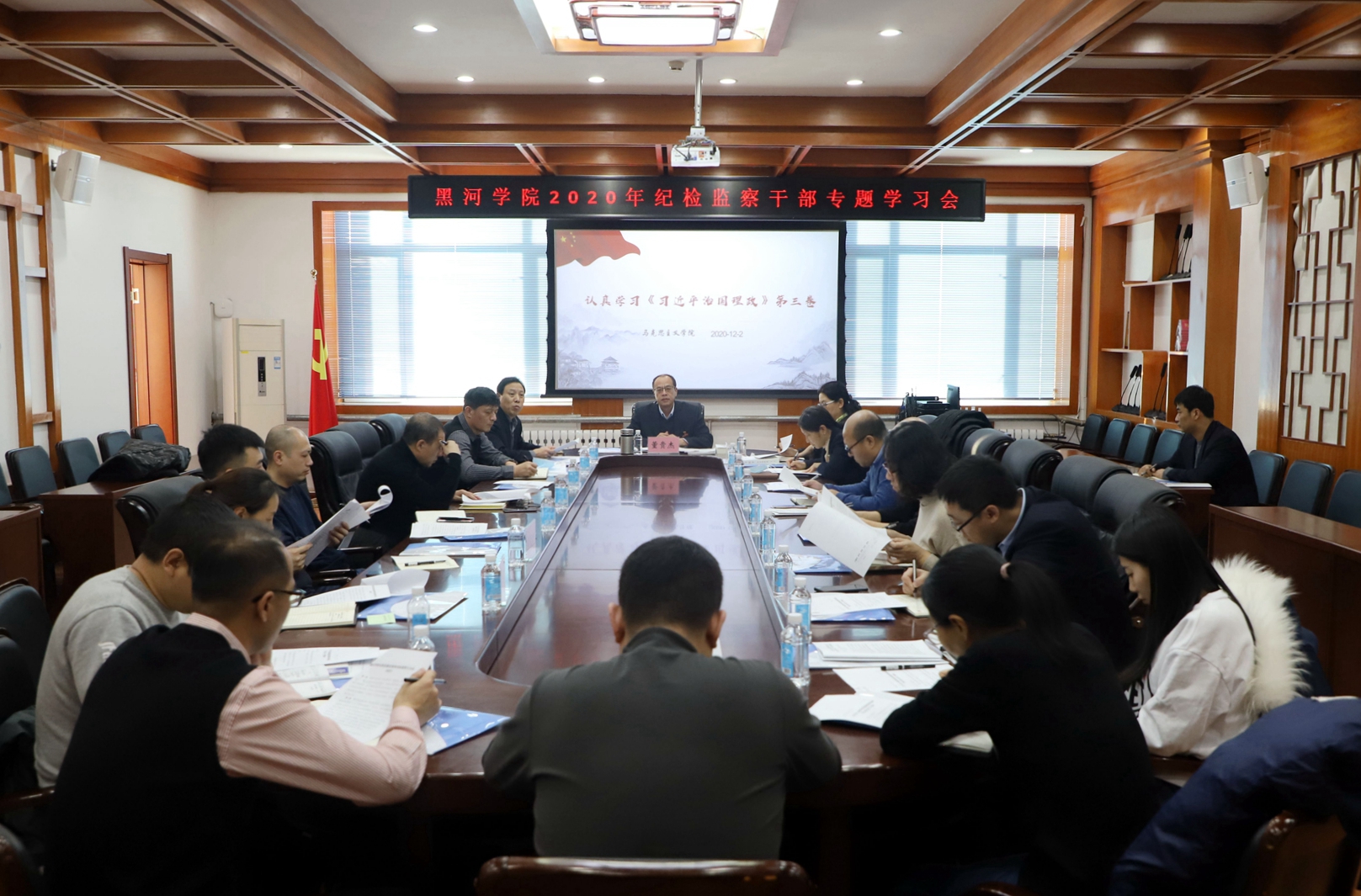 校纪委副书记、纪检监察处处长姜占民解读《黑河学院纪检监察监督事项备案暂行办法(试行)》;与会人员书面学习2020年10月29日中国共产党第十九届中央委员会第五次全体会议通过的中共中央关于制定国民经济和社会发展第十四个五年规划和二〇三五年远景目标的建议及关于《中共中央关于制定国民经济和社会发展第十四个五年规划和二〇三五年远景目标的建议》的说明。