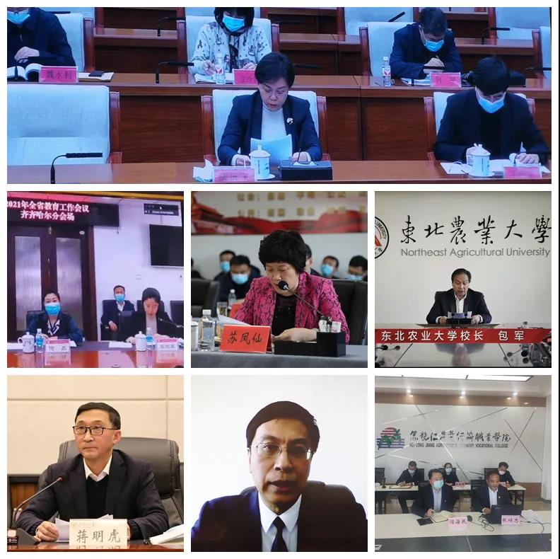 会上,播放了“十三五”龙江教育改革发展成就专题片,哈尔滨、齐齐哈尔、牡丹江3个地市和东北农业大学、东北石油大学、黑河学院、黑龙江农业经济职业学院等4所高校作了会议交流发言。各普通高校党政主要负责同志、班子成员;各市(地)党委教育工作领导小组组长、政府(行署)分管教育领导、教育局班子成员;省委教育工委、省教育厅班子成员,机关各处室、厅直属单位主要负责同志通过视频会议系统参会。