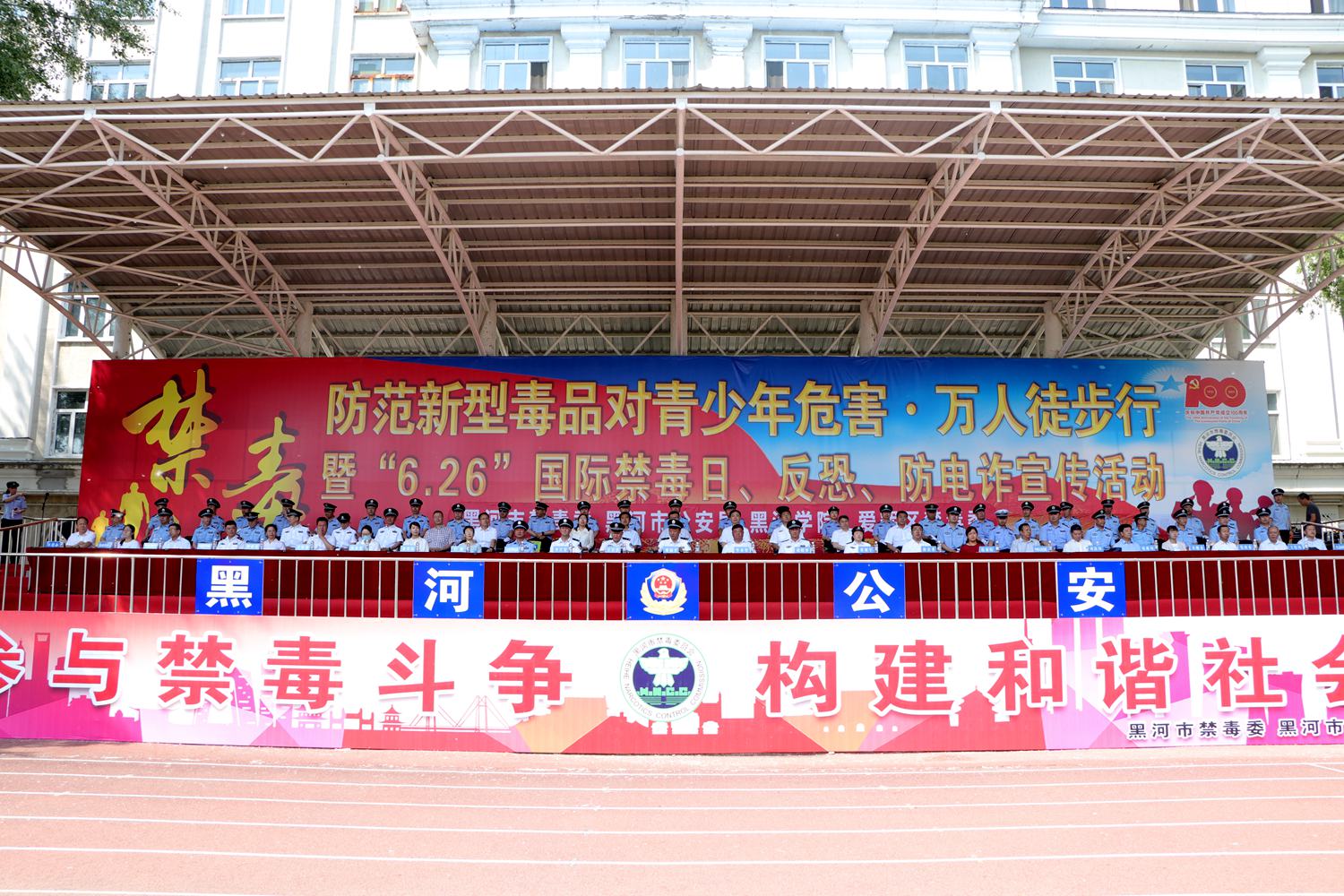 为进一步推进文明校园建设,增强学生禁毒、反恐、反诈意识,6月26日,黑河市在我校体育场举行“防范新型毒品对青少年危害·万人徒步行”暨“6.26”国际禁毒日、反恐、反诈宣传活动。黑河市副市长、市禁毒委主任、市公安局党委书记、局长邓福才出席活动并致辞,我校副校长车永宏,市禁毒委各成员单位、市公安局、城区公安分局、边境管理支队、交警支队、警训中心、市局各部门负责人及公安民警、禁毒志愿者、我校学生代表2800余人参加活动。
