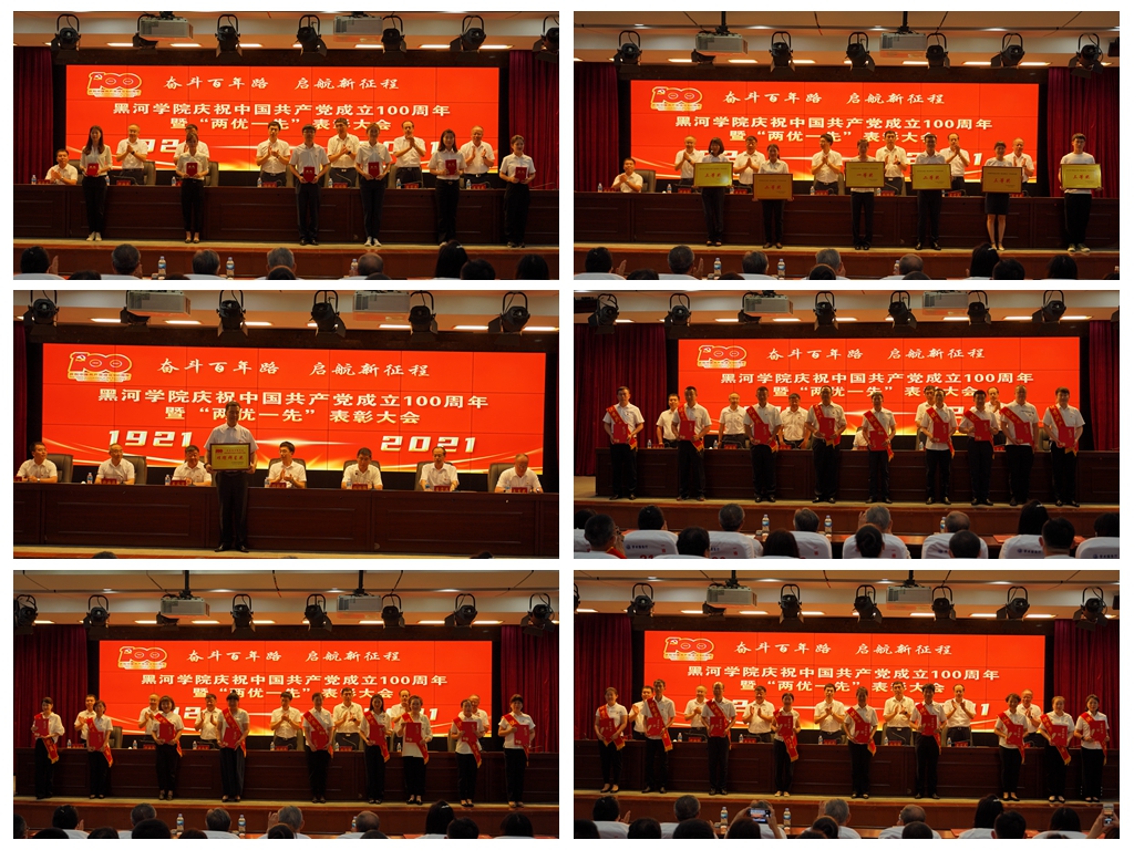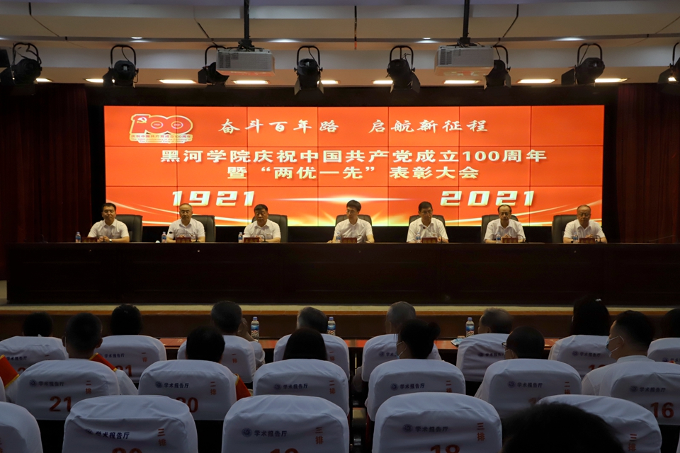 喜迎百年华诞,共襄复兴伟业。为表彰先进、弘扬正气、鼓舞斗志,进一步动员和激励广大基层党组织、共产党员和党务工作者为学校高水平高质量发展作出新的更大贡献,以优异成绩迎接建党百年华诞,6月30日,黑河学院庆祝中国共产党成立100周年表彰大会在求知楼报告厅召开,学校党委班子成员、副科级以上干部、党支部书记、组织员、“光荣在党50年”纪念章获得者、“两优一先”表彰人员及各学院学生代表参加大会,会议由党委副书记张焕强主持。