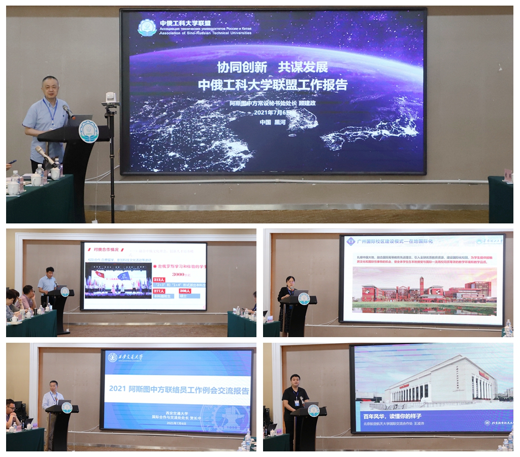 会上,顾建政代表阿斯图中方常设秘书处向大会作了工作报告,全面总结了联盟2020—2021年的建设情况及未来发展规划。黑河学院、华南理工大学、西安交通大学、北京航天航空大学的国际交流合作处负责人结合中俄战略合作最新动态,围绕各自学校国际交流合作发展现状和未来规划等方面作了工作报告。