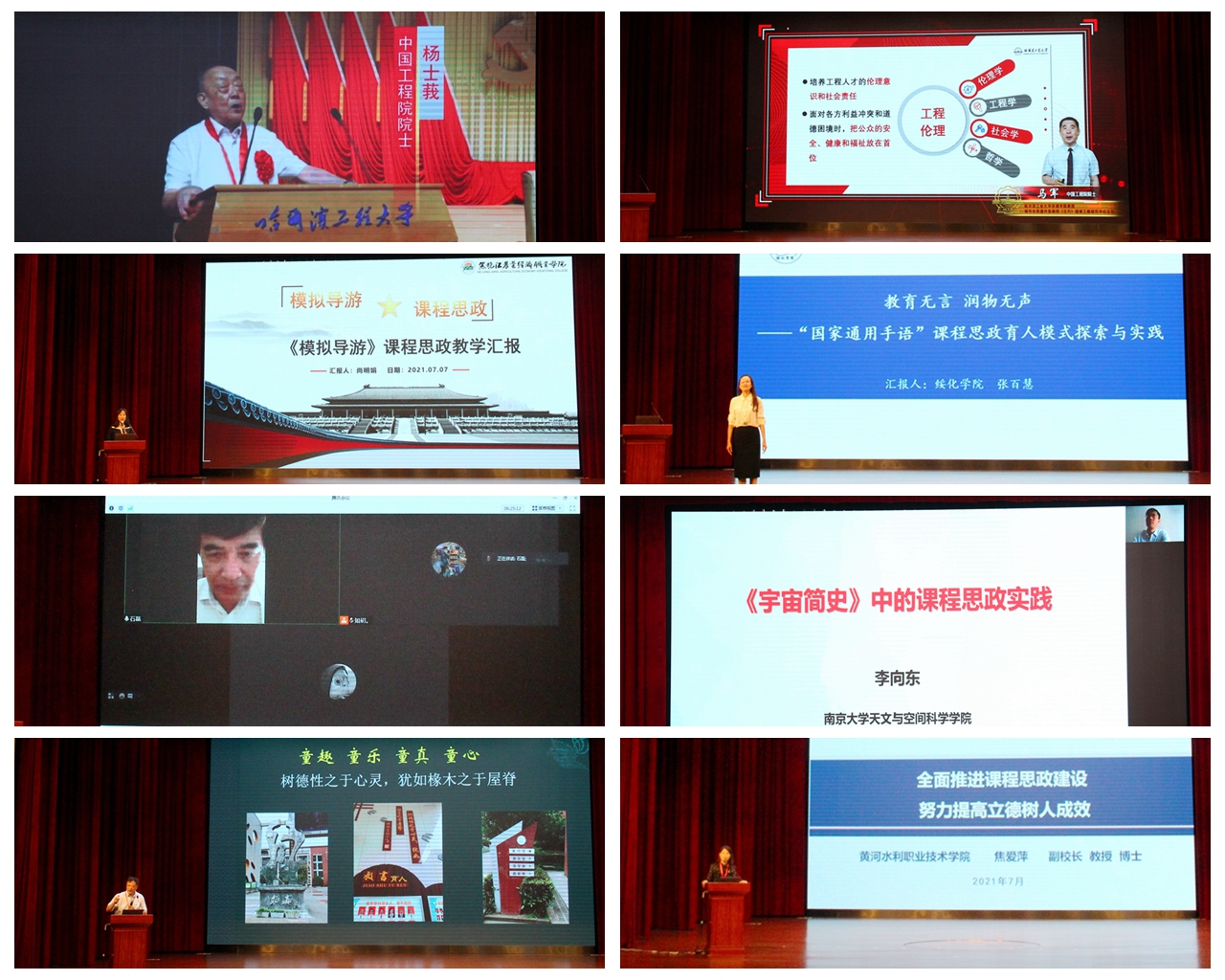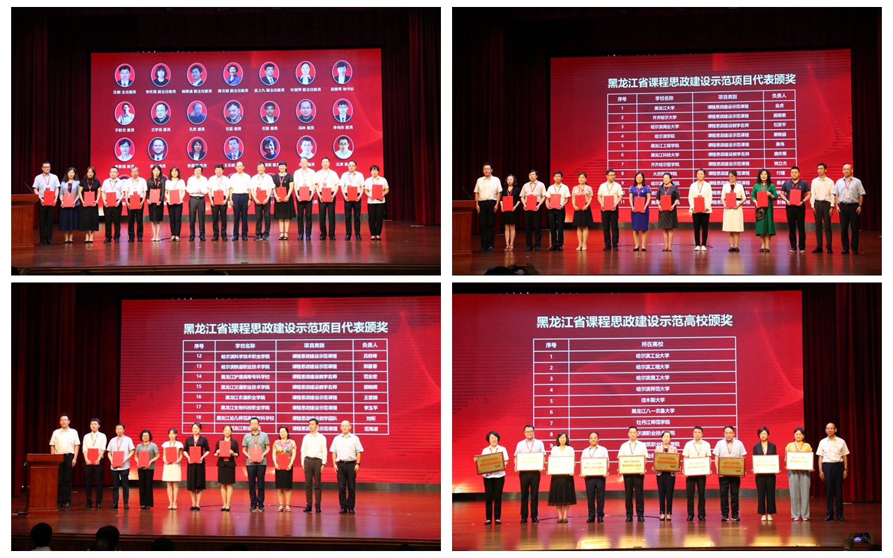 会议举行了黑龙江省首届高校课程思政建设专家委员会成立仪式,表彰了获得首批课程思政示范项目奖励的高校及教师,哈尔滨工程大学杨士莪院士、哈尔滨工业大学马军院士、黑龙江农业经济职业学院教师尚明娟、绥化学院教师张百慧、复旦大学教师石磊、南京大学教师李向东、四川大学教师石坚、黄河水利职业学院教师焦爱萍分别通过线上和线下方式进行了经验分享。