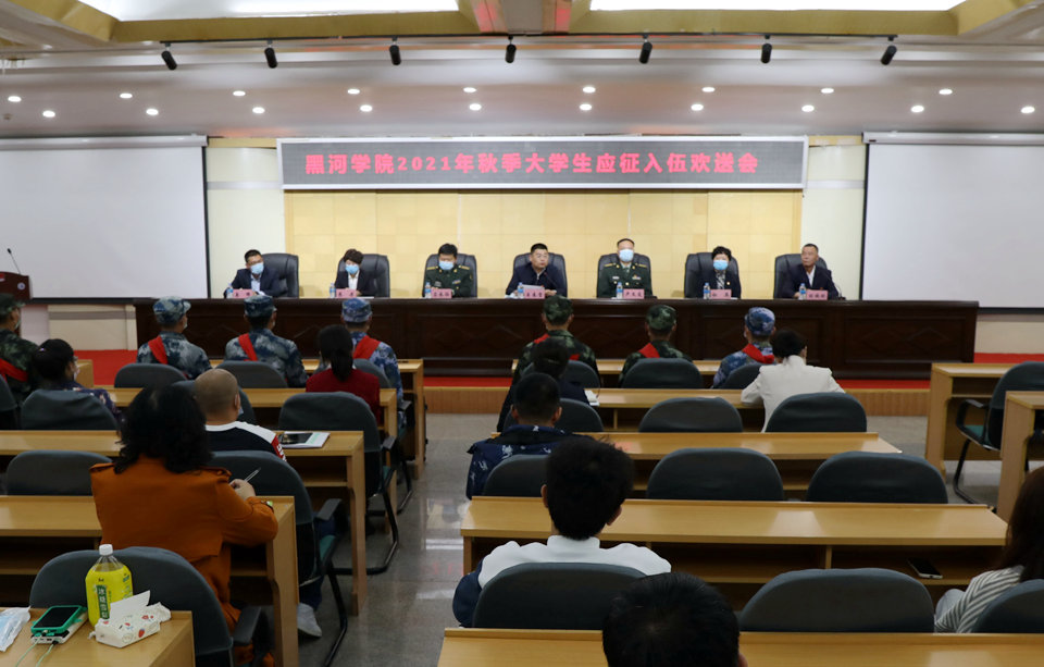 9月14日,我校2021年秋季应征入伍欢送会在明德楼五楼多功能厅举行。党委副书记王春雷,黑河军分区动员处处长卢文友,黑河市爱辉区武装部部长左长征,各学院党总支书记、辅导员、学生代表及相关部门负责人同2021年秋季全体应征入伍学生、往年退役士兵代表出席会议。会议由学生工作部(处)·武装部部长刘铁刚主持。卢文友处长宣读了黑河学院2021年秋季应征入伍学生名单及分配方向;与会领导为应征入伍学生佩戴红花并颁发纪念品。