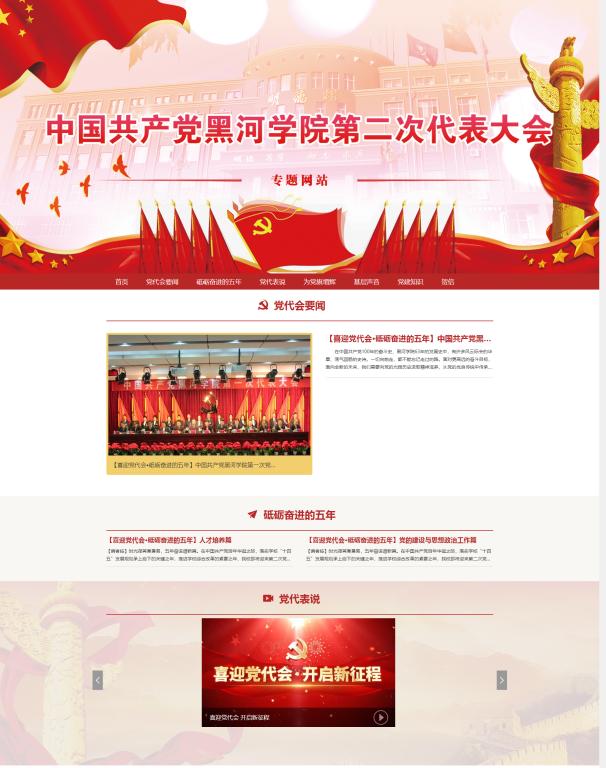 聚焦新发展,奋进新征程。中国共产党黑河学院第二次代表大会将于10月召开。今天,黑河学院第二次党代会专题网站上线啦!网站设有党代会要闻、砥砺奋斗的五年、党代表说、为党旗增辉、基层声音、党建知识、贺信、寄语党代会等栏目。全面聚焦党代会筹备工作和会议盛况,集中展示学校第一次党代会以来的发展成就,宣传介绍一线教职工和学生党员代表先进事迹,团结鼓舞全体师生员工坚定信心、砥砺前行,迎接学校第二次党代会胜利召开,凝心聚力把第二次党代会开成团结、奋进、胜利的大会。