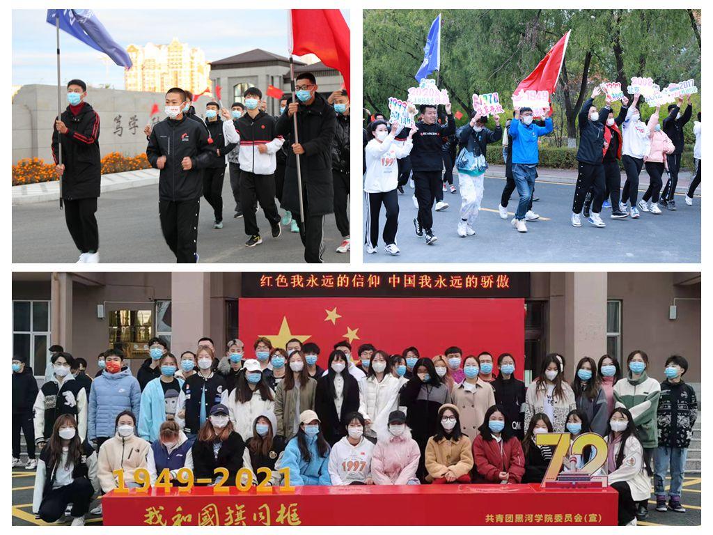 早上6点,党委副书记王春雷与校团委全体人员、各学院百余名师生齐聚校园接力跑起点。师生们手持国旗和校旗,伴着清晨第一缕阳光,沿着校内设置的1949年开国大典、1950年抗美援朝、1978年改革开放、1997年香港回归、1999年澳门回归、2008年北京奥运、2012年首次载人空间交会对接、2017年第十九次全国代表大会、2020年武汉抗击新冠疫情战役胜利及2021年脱贫攻坚战取得全面胜利10个建国以来中国发展历程的接力站点,携手共进,环校奔跑。同学们用年轻、健康、阳光、积极的方式,响应了习近平总书记“全民健身”的号召,表达了青年学子对祖国母亲的深深祝福。