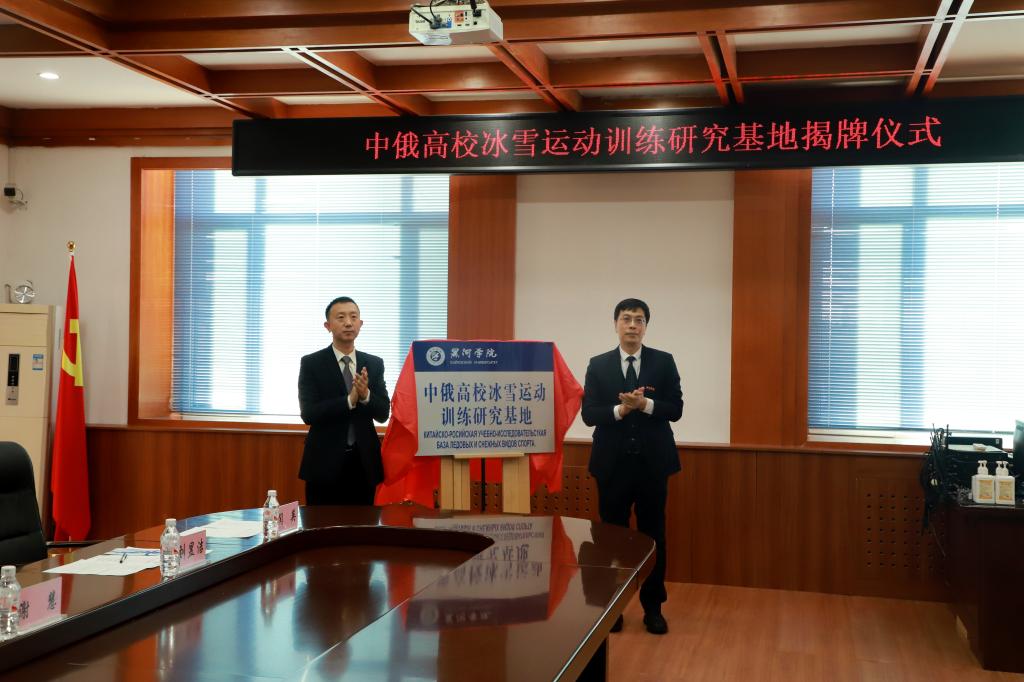 会上,校长杨敬民与黑河市体育局局长付振南共同为“中俄高校冰雪运动训练研究基地”揭牌。