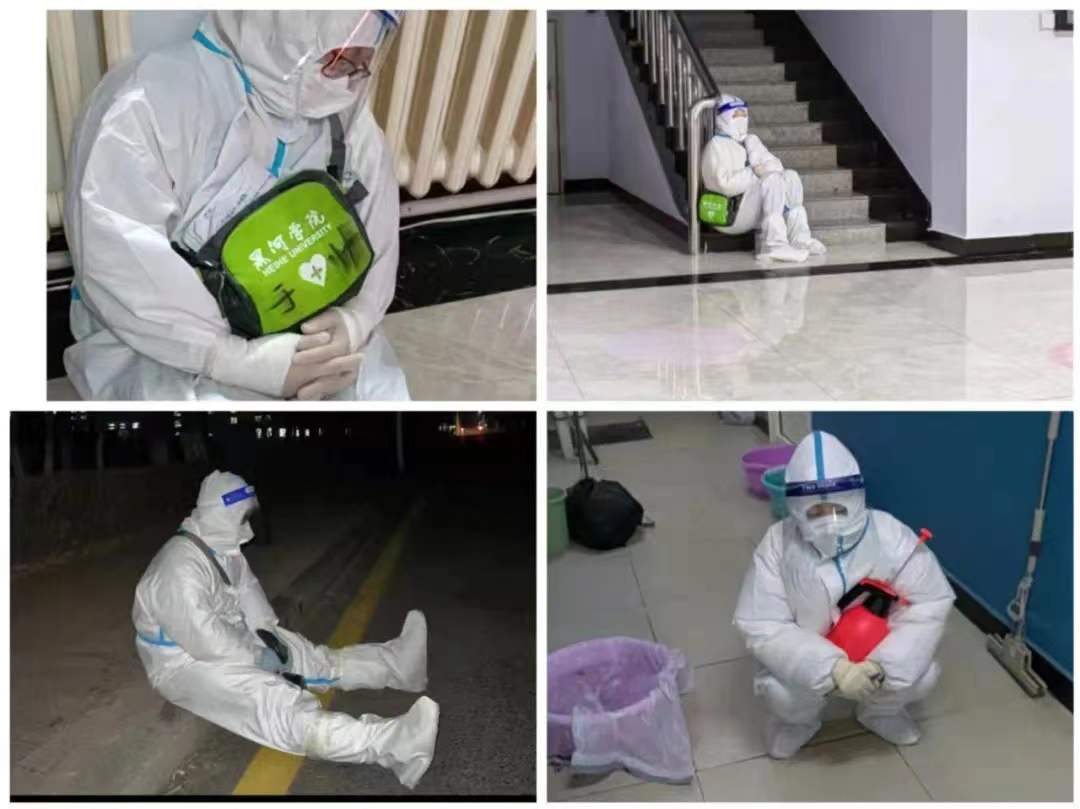 昏暗的灯光下,穿上笨重的防护服已然看不清他们的面庞,而这时,密不透风的防护服既是他们的铠甲,也是要面对的严峻考验。由于脱下来的防护服无法再次使用,加之为了节省来回换脱的时间,医护人员们一穿上就不舍得脱下来,这一穿,往往就是五六个小时。因此,不喝水不上厕所成了常态,很多人也累到了虚脱,甚至连续晕倒。有时候穿上防护服就能忙一整天,家人们时常因为联系不上他们而感到惦念。在这些人中,有80岁母亲的儿子,有未满周岁孩子的妈妈,他们平日在各自岗位上宵衣旰食、恪尽职守,而在疫情来临的紧要时刻,他们毫不犹豫地披上战袍,成为召之即来、来之能战的校园抗疫勇士。