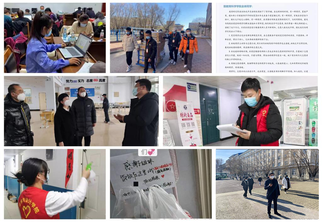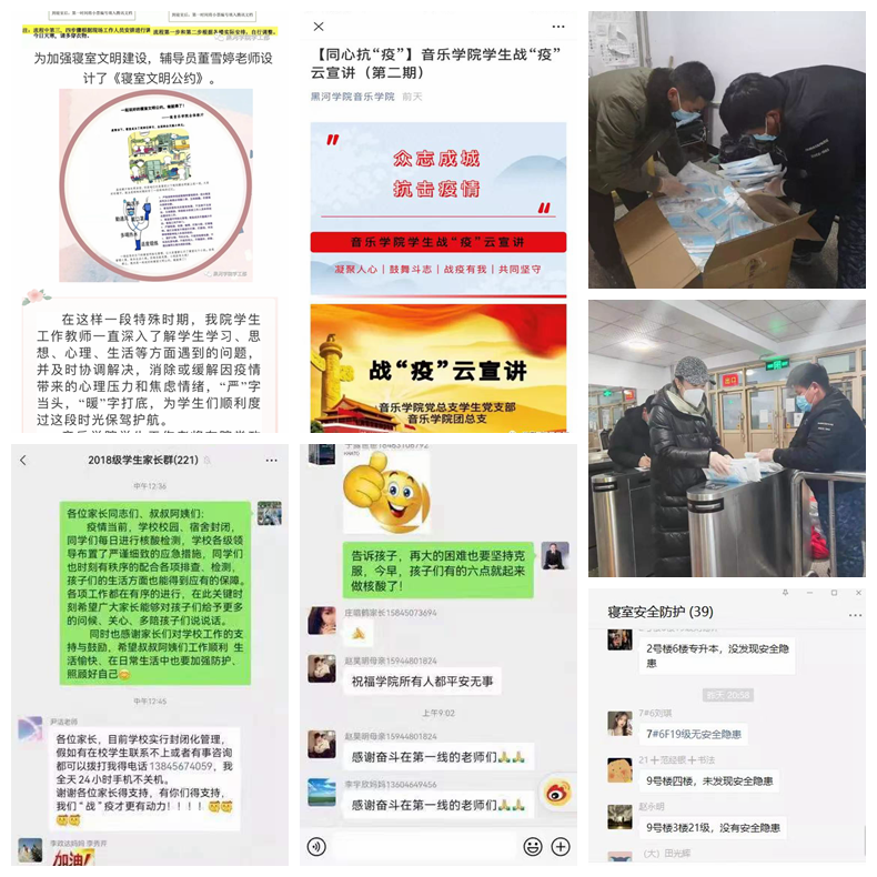 在这个特殊时期,各学院教师在保证教学质量“不打折扣”的同时,与学生们一起隔离疫情不隔离爱。教师们将“生命至上,举国同心,舍生忘死,尊重科学,命运与共”伟大抗疫精神融入课堂之中,并通过电话、微信、QQ等方式与学生实时沟通,为学生答疑解惑,引导学生理性面对疫情。各学院也纷纷发动团支部、各班级组织形式多样的战“疫”团活、主题班会活动;通过开展线上支部会、线上学生工作会、制作辅导员给学生一封信短视频、“不放弃”手语操、发布《寝室文明公约》等方式,表达特殊时期的温情与希望;组建“送饭小分队”,全力保障校内临时健康监测的同学饮食和学习生活。此外,正在参加顶岗实践学生也分别在北安、五大连池、孙吴等地积极投身疫情防控工作,在战“疫”一线展现当代大学生的责任与担当。