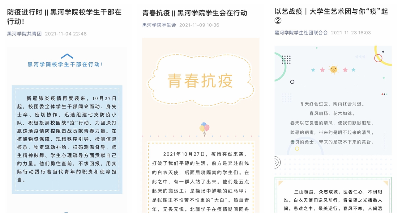 这次战“疫”,校团委在学校党委的领导下,积极发挥共青团组织作用,认真落实学校各项工作要求,为疫情防控相关工作提供了应有的助力。充分发挥网络宣传短平快的优势,连续发布《黑河学院致全体同学及家长的一封信》《致战“疫”一线全体师生员工的一封信》等信息,引导广大团学干部聚焦时事讯息,凝聚战胜疫情信心,共同肩负起“抗击疫情”的青春担当。各学院团学组织和学生社团以学生兴趣爱好为战“疫”载体,推出了一批大家喜闻乐见的战“疫”作品。“以艺战‘疫’,大学生艺术团与你‘疫’起”、“青春战‘役’,‘抖’出正能量”主题短视频大赛、“疯狂的口罩 疯狂的DIY”口罩设计大赛、风雨同舟‘声’援疫情”音频大赛等活动,一幅画、一首歌、一支舞蹈、一个短视频、一段音频……虽然微不足道,但传播的是社团带给身边同学抗击疫情的温暖,展现的是社团为时代画像、为时代立传、为时代明德的信心,凝聚的是北疆青年抗击疫情的强大精神力量。