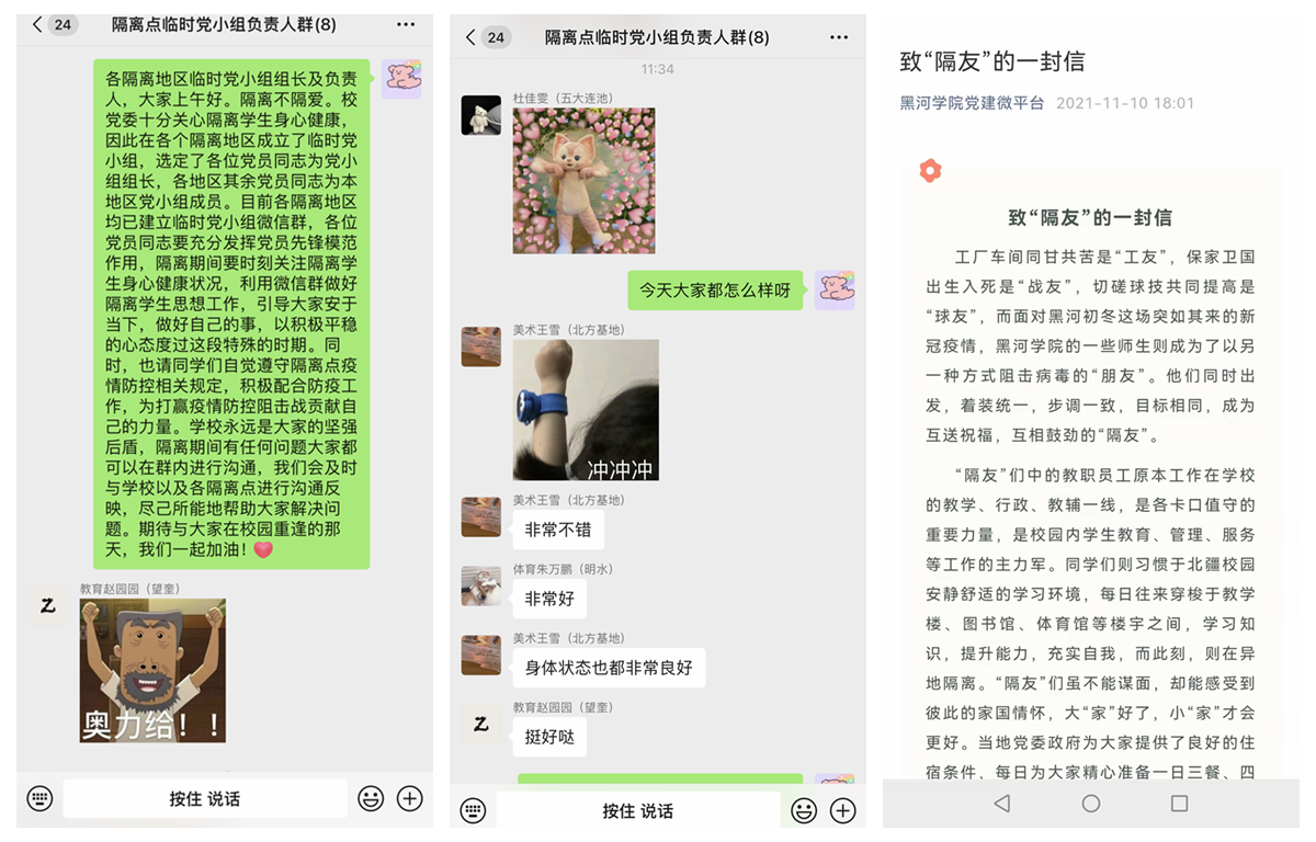 为了在打赢疫情防控歼灭战中更好地发挥基层党组织战斗堡垒作用和党员先锋模范作用,学校组建9个公寓临时党支部,并在五大连池、青冈等七个隔离地区成立临时党小组,要求他们“把好学生管理关、把好学生思想关、把好心理健康关、把好防控学习关”。隔离期间,临时党小组及时向隔离人员传达关于疫情防控相关精神,转达学校党委对他们的关心、关爱,尽一切力量解决后顾之忧,让在外隔离学生安心、放心。