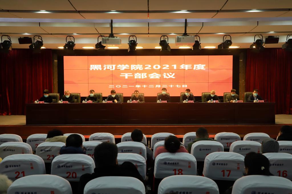 杨弘宇从全面加强党的领导,切实强化党的政治建设;全面推进内涵发展,学校综合实力明显增强;坚持推进党风廉政建设,政治生态持续好转;坚持生命至上,筑牢校园疫情防控安全线等方面回顾了2021年学校各项工作取得的显著成绩,并代表学校对全体教职工一年来的辛勤付出和突出贡献表示衷心感谢。他指出,2021年是极不平凡的一年,面对两度疫情,黑河学院在省委、省政府和省教育工委、省教育厅正确领导下,始终坚持以习近平新时代中国特色社会主义思想为指导,深入学习贯彻习近平总书记“七一”重要讲话精神、党的十九届六中全会精神、《中共中央关于党的百年奋斗重大成就和历史经验的决议》,加强党对高校的全面领导、全面贯彻党的教育方针,落实立德树人根本任务,紧密围绕省委“六个强省”建设目标,主动对接国家振兴东北战略、“一带一路”建设和自贸区建设,以做好“12368+10”系列工作为统领,全面强化内涵建设、深化综合改革、推进依法治校,疫情防控成效和各项工作都取得显著成绩,持续开创了学校事业发展的新局面。