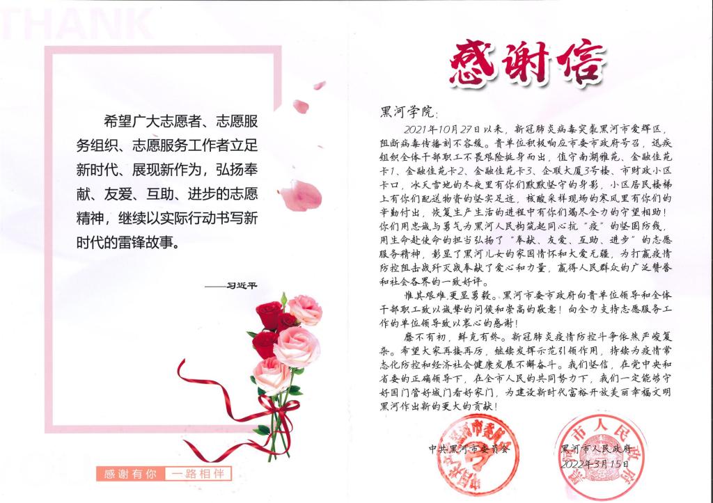 近日,我校收到黑河市人民政府发来的感谢信,对积极参与黑河市疫情防控社区值守包保工作的全体党员干部、教职员工表示感谢。疫情就是命令,防控就是责任,自黑河市发生新冠肺炎疫情以来,在学校党委的坚强领导下,黑河学院全体共产党员、教职员工奋勇向前、勠力同心,用坚强党性和责任担当筑起抗击疫情“中流砥柱”。