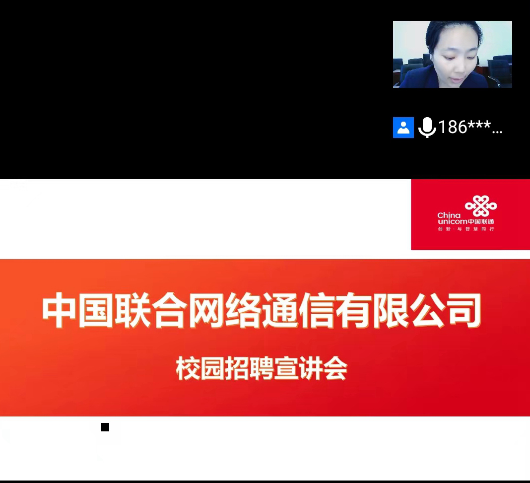为扎实做好学校领导访企拓岗促就业专项行动,4月22日,学校组织召开了中国联通黑河市分公司专场线上宣讲会。中国联通黑河市分公司人力资源部张慧介绍了招聘岗位和薪资待遇等需求信息,2018级、2019级300余名学生线上参加会议,并与公司相关负责人进行了深入交流。