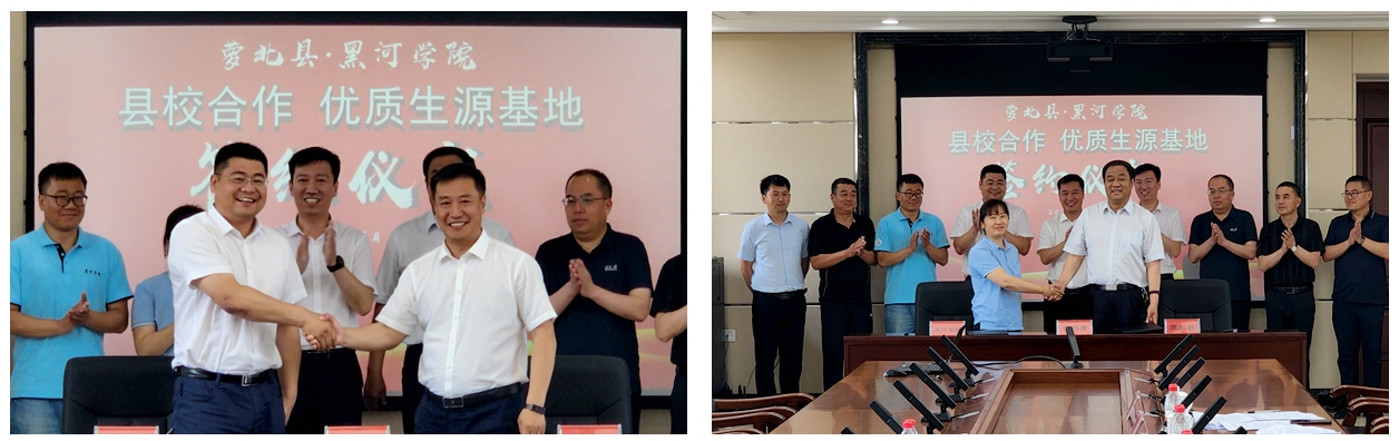 王春雷代表学校与萝北县县委书记孙坤签订“县校合作”协议,并出席“优质生源基地”协议签订及揭牌仪式。