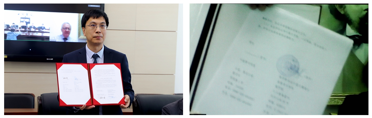 与会人员观看了我校毕业生为学校拍摄的视频短片;杨敬民校长与史卡鲁巴·瓦列里·德米特里耶维奇校长分别代表两校签署合作协议。