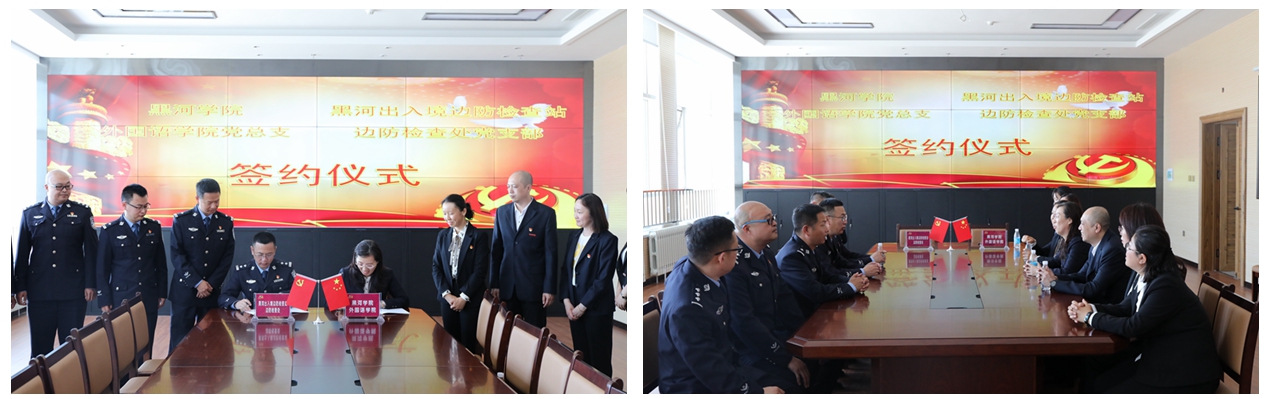 为发挥警民共建优势,深化警地党组织联建联创,以党建共建推进更深层面的合作交流,在纪念中国共产党成立100周年之际,5月21日,外国语学院党总支和黑河出入境边防检查站边检处党支部联合开展“建党百年同欢庆,铭记历史守初心”主题党日活动,签订共建协议。