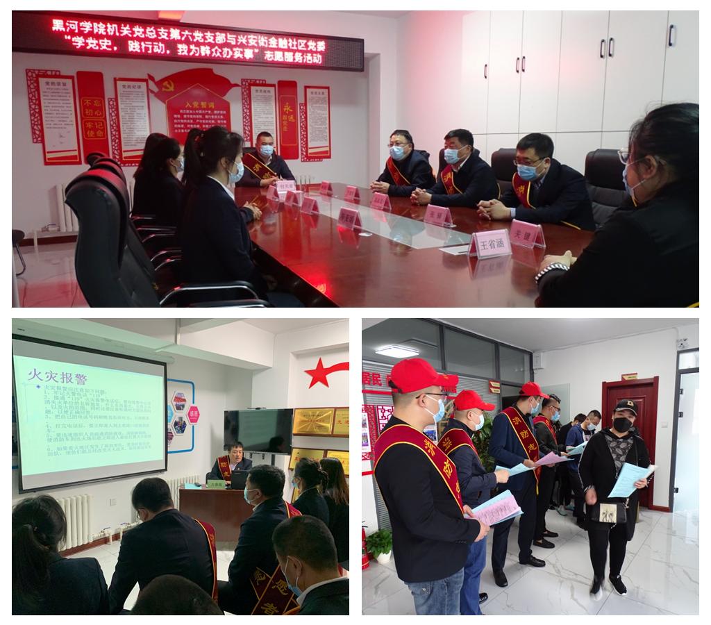 5月17日,机关党总支第六支部与兴安街金融社区党委联合开展了“学党史,践行动,我为群众办实事”消防安全进社区主题党日活动,全体党员及社区干部和工作人员、来往群众近百人参加此次活动。保卫处消防科负责人以图文并茂、新闻报道、事故分析、现场说法等方式,播放讲解了近年发生的多起重大火灾事故的实例视频,用触目惊心的画面和数字使大家的心灵受到了极大的震撼,深刻认识到了“隐患险于明火、防范胜于救灾”的重要性。活动中,副校长车永宏与支部党员向社区群众发放了消防知识宣传单,并针对大家生活的实际情况,结合在工作上和生活中用电、用气、用火的知识,详细讲解了发生火灾后的自防、自救、逃生技能,并按种类、功能、用途介绍了不同灭火器的使用方法。