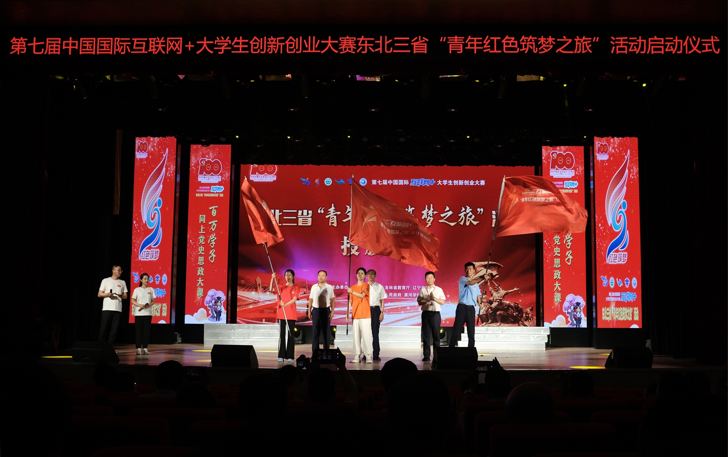 启动仪式上,黑龙江省教育厅二级巡视员丁哲学、吉林省教育厅副厅长孙长智、辽宁省教育厅二级巡视员杨为群为三省高校代表授红旅分队旗。