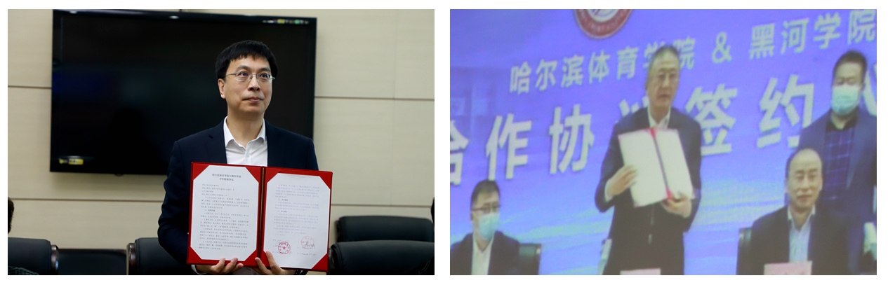 5月19日,我校与哈尔滨体育学院在明德楼二楼会议室举行合作框架协议线上签约仪式。哈尔滨体育学院党委副书记、校长陈德明,副校长王金满,我校党委副书记、院长杨敬民,副院长谢慧和两校体育学院、国际教育学院、教务处、科研处、国际交流合作处等相关部门负责人参加签约仪式。